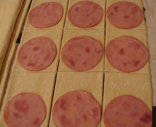 Se aseaza pe fiecare patratel cate o branza topita iar pe fiecare branzica cate o bucata de sunca.
